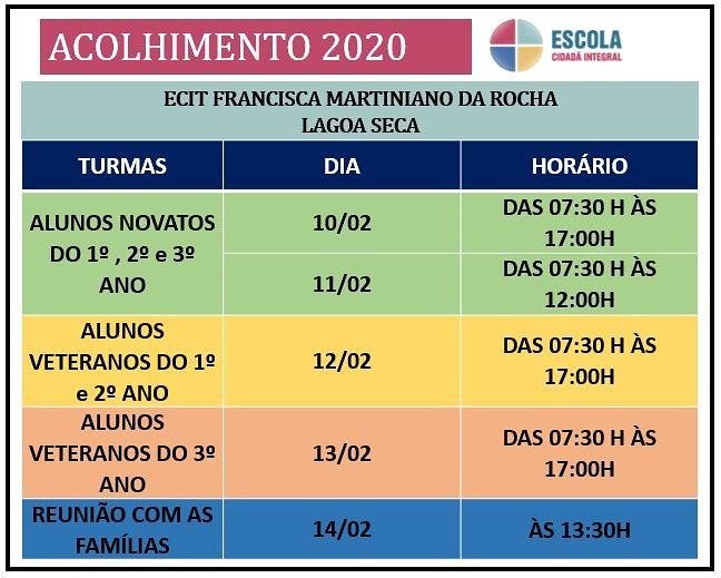Para estudantes da rede estadual, as aulas também começam na segunda que vem. Só que a Escola Estadual Francisca Martiniano da Rocha preparou o que a instituição chama de “semana de acolhimento”, com objetivo de que pais e alunos conheçam bem a instituição e o modo didático integral dela. De 10 a 13 de fevereiro será feito uma recepção às turmas dos novatos e veteranos, cada uma dentro do calendário estabelecido. Já na sexta, dia 14, as famílias deverão estar presentes na reunião que acontece às 13h30, conforme mostra o calendário divulgado pela escola. Depois disso, as aulas normalizam.