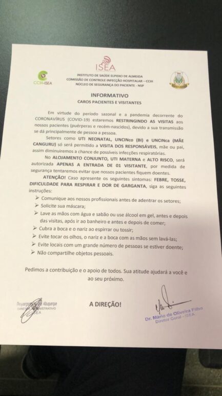 o diretor administrativo do ISEA, Denybersson Carvalho, garantiu que a restrição não vai atingir os pais. Esses permanecem com acesso livre as visitas e que nesse primeiro momento o cuidado maior são com as UTI’s.