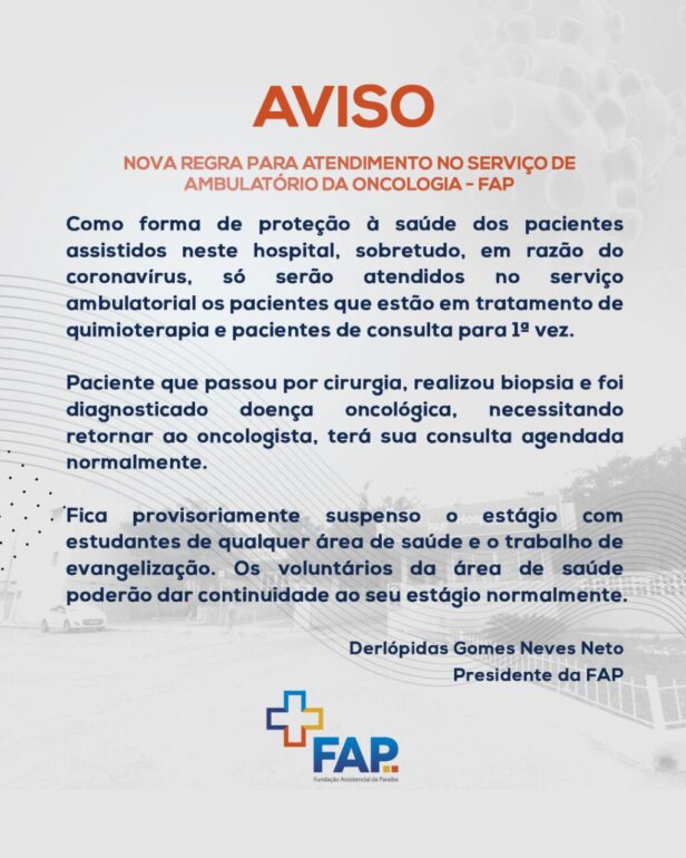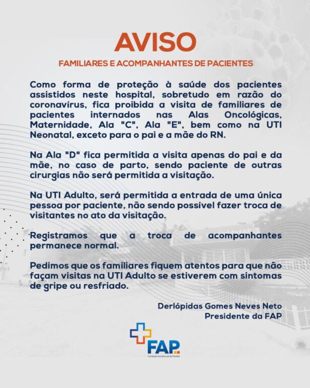 O Hospital da Fundação Assistencial da Paraíba (FAP) emitiu na manhã desta terça-feira (17) avisos destinados a familiares, acompanhantes de pacientes e a toda a população que necessite fazer uso dos serviços da unidade hospitalar sobre mudanças efetuadas em seu regimento interno em decorrência da recente proliferação do novo coronavírus (COVID-19).