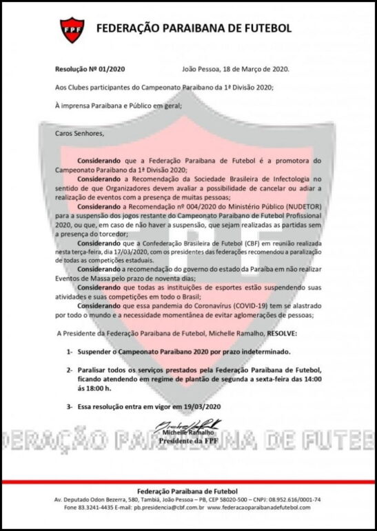 A medida também vai paralisar todos os serviços prestados pela Federação Paraibana de Futebol, ficando atendendo em regime de plantão de segunda a sexta-feira das 14h às 18h.