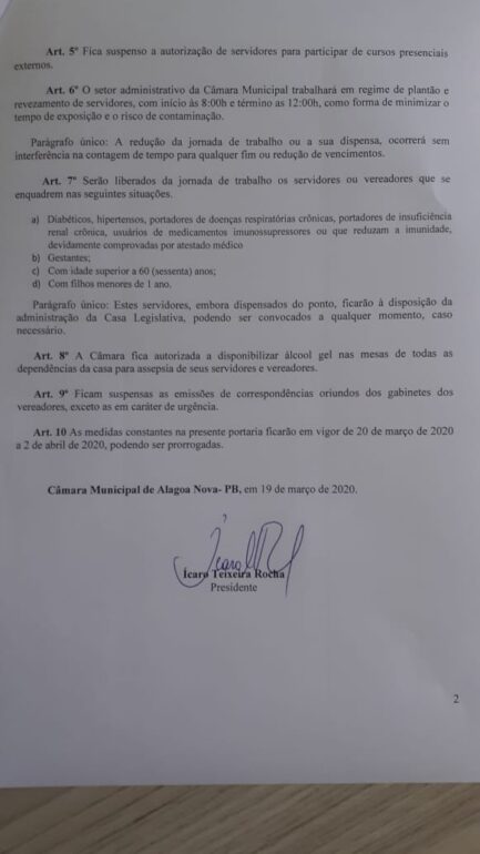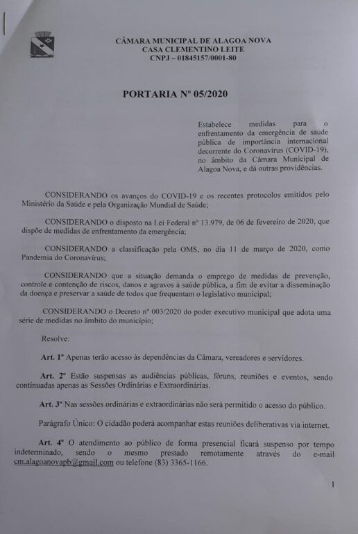 Nesta quinta-feira (19) a Câmara Municipal de Alagoa Nova, na pessoa do presidente da casa, vereador Ícaro Teixeira, divulgou um decreto que suspende a presença de pessoas no plenário durante as sessões, atendendo a recomendação para que se evite aglomerações.