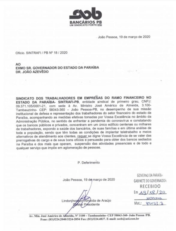 Os bancários solicitaram ao Governo do Estado, a suspensão imediata dos atendimentos presenciais nas agências bancárias da Paraíba. A solicitação foi feita nesta quinta-feira (19), através do Sindicato dos Bancários da Paraíba, que protocolou um ofício ao governador João Azevedo, solicitando medidas efetivas para a suspensão do atendimento presencial, bem como todo e qualquer serviço que concorra para a aglomeração de pessoas, como forma de combate à Pandemia do Coronavírus.