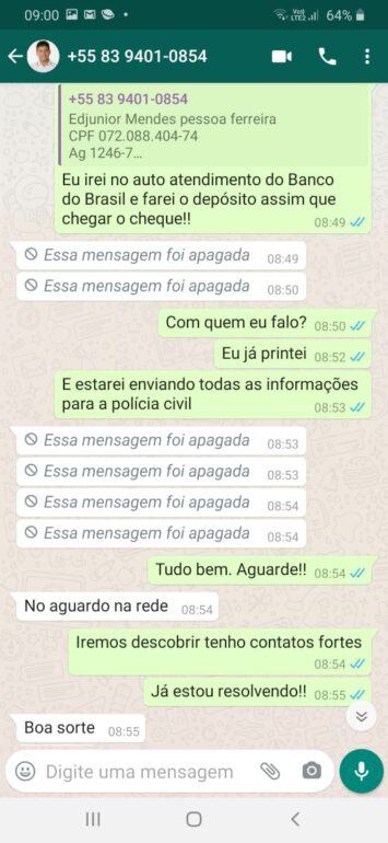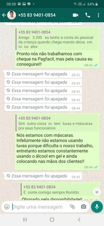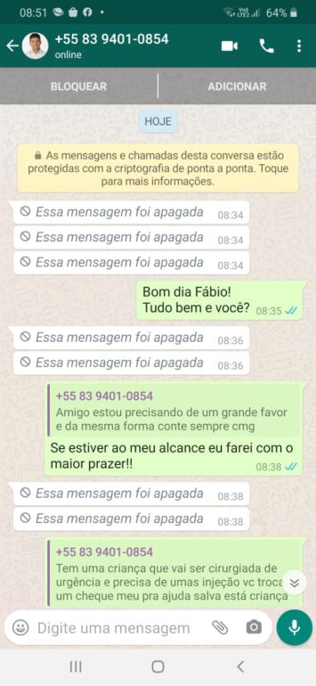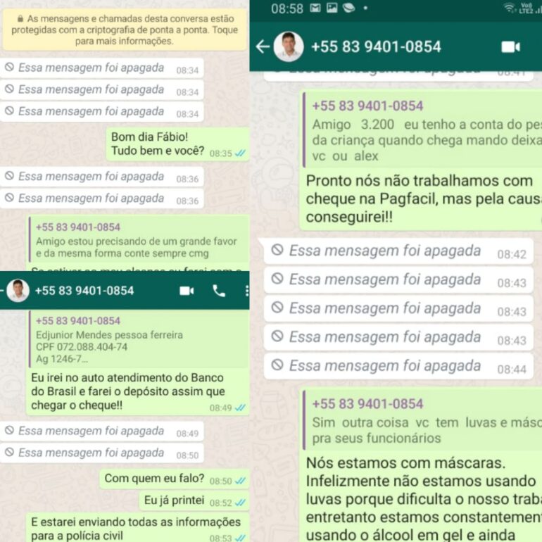 Nas conversas, que foram printadas pela vítima, dá pra perceber, mesmo o golpista apagando as mensagens após ser descoberto, a ação da tentativa de tirar dinheiro do empresário.