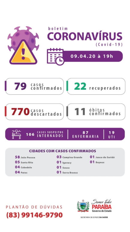 Dos casos confirmados nesta quinta, 09 de abril, são 19 no município de João Pessoa, 1 em Santa Rita, 2 em Patos e 2 em Cabedelo.