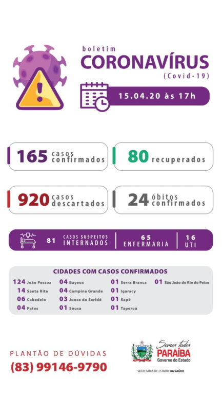 Dos 165 casos confirmados até esta quarta, 15 de abril, 80 já se recuperaram, 24 foram a óbito e 15 estão hospitalizados, 4 deles em leitos de UTI. Os demais se recuperam em isolamento domiciliar acompanhado pelas secretarias municipais de saúde.