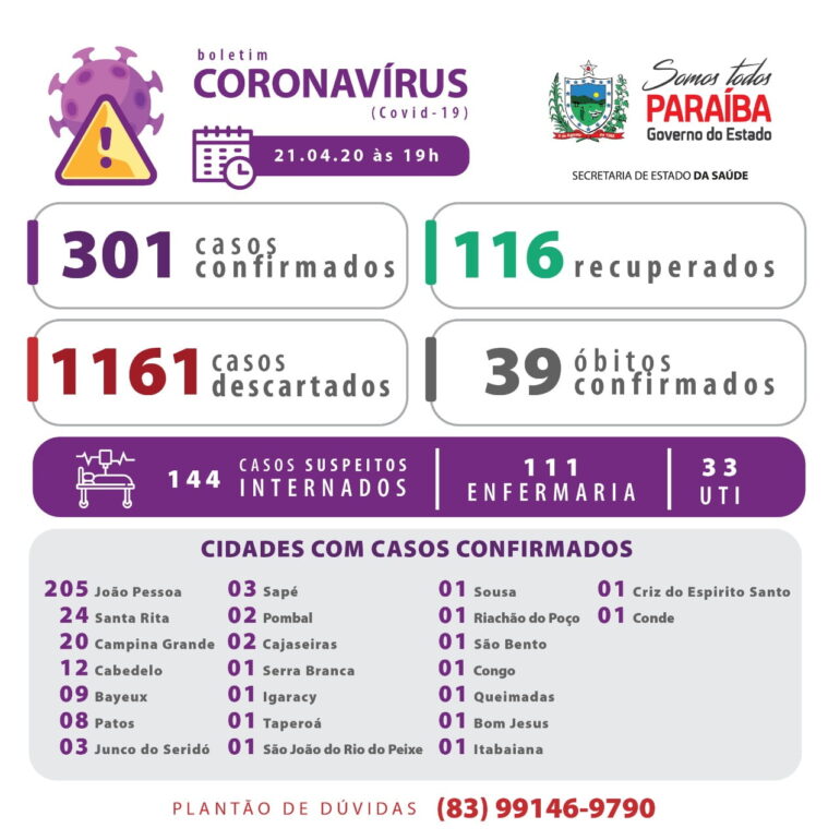 Dos 301 casos confirmados, 116 já se recuperaram. Atualmente a Paraíba tem 1.161 casos descartados.