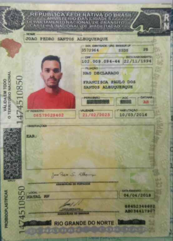 Quando foi detido, no final da tarde de ontem, conduzindo um veículo de luxo modelo Compass Jeep – com restrição de roubo/clonado – o acusado foi levado para delegacia e lá, apresentou um documento de CNH falso com nome de João Pedro dos Santos Albuquerque (foto). O que ele não esperava, é quando seu advogado chegou para lhe acompanhar, apresentou sua documentação correta e assim, ele foi realmente identificado como sendo o estudante universitário Alberto Jorge de Siqueira Júnior, de 29 anos.