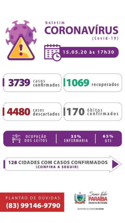 Destes, 170, infelizmente, faleceram e 1.069 já se recuperaram, segundo informações das Secretarias Municipais de Saúde. Outros 4.480 casos investigados já foram descartados para Covid-19. Dos leitos de UTI para adultos ativados em todo o Estado, 62% estão ocupados. Na Região Metropolitana de João Pessoa, a taxa de ocupação de UTI para adultos é de 78%.