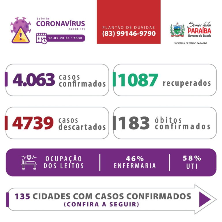 Neste sábado, 16 de maio, a Paraíba registra 324 novos casos de Covid-19 e 13 óbitos confirmados causados pela doença. Assim, como previsto, a Paraíba atinge 4.063 casos de Covid -19. São 183 vítimas fatais e 1.087 pessoas que já se recuperaram, segundo informações das Secretarias Municipais de Saúde. Dos leitos de UTI para adultos ativados em todo o Estado, 62% estão ocupados. Na Região Metropolitana de João Pessoa, a taxa de ocupação de UTI para adultos é de 74%. Apenas 47% da população seguiram a recomendação de Isolamento Social segundo a Inloco quando o Ideal é de 70%.