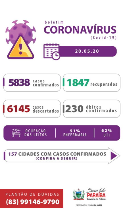 Nesta quarta, 20 de maio, a Paraíba registra novo recorde com 538 novos casos de Covid-19 e 11 óbitos confirmados desde a ultima atualização. São 5.838 paraibanos que já contraíram a doença, 1.847 pessoas que já se recuperaram e 230, infelizmente, faleceram.