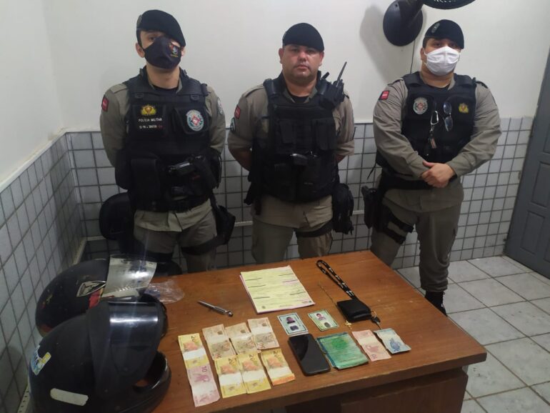 De posse destas informações, diversas viaturas foram acionadas e rondas foram feitas até os criminosos serem avistados e abordados no bairro Nordeste, onde foram recuperados com os mesmos cerca de R$ 250 e a moto utilizada no crime, recuperada apenas após os homens informarem ao COPOM que haviam abandonado a mesma próximo a um matagal da região.