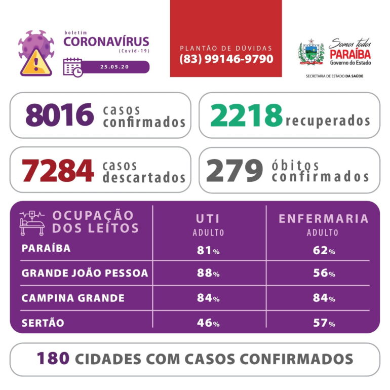 Nesta segunda, 25 de maio, a Paraíba registra 193 novos casos de Covid-19 e 7 óbitos confirmados desde a ultima atualização. São 8.016 paraibanos que já contraíram a doença, 2.284 pessoas que já se recuperaram e 279, infelizmente, faleceram.