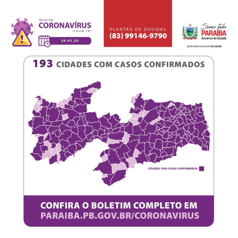 Neste sábado, 30 de maio, a Paraíba registra 851 novos casos de Covid-19 e 19 óbitos confirmados desde a ultima atualização. São 12.862 paraibanos que já contraíram a doença, 2.472 pessoas que já se recuperaram e 346, infelizmente, faleceram. Até a data de hoje já foram realizados 44.912 exames, entre teste rápido e PCR.