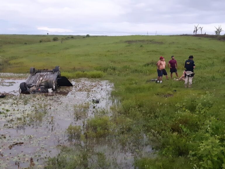Um veículo capotou e caiu em um açude próximo à rodovia BR-230, sentido Campina Grande João Pessoa, nesta quarta-feira (10). O motorista perdeu o controle do automóvel e saiu da pista, próximo ao Cajá.