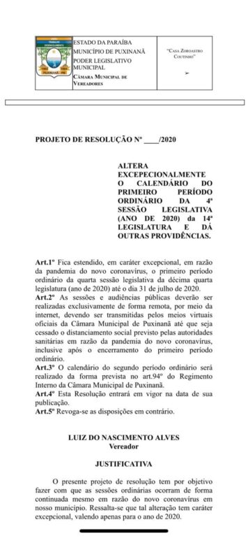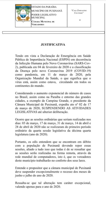 Entende o propositor que a câmara municipal de Puxinanã deve suspender excepcionalmente o recesso dos meses de junho e julho do ano de 2020.