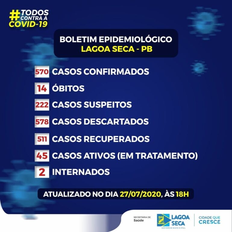 A Covid-19 fez mais duas vítimas fatais em Lagoa Seca durante este fim de semana. As informações constam no boletim epidemiológico divulgado pela Secretaria de Saúde nesta segunda-feira (27). Com isso, o município passa a ter 14 óbitos pelo novo coronavírus e 570 infectados – 25 novos casos só nas últimas 72h.