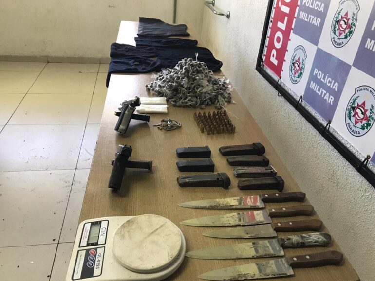 Uma operação realizada pelo Batalhão de Operações Especiais (Bope) da Polícia Militar, nesta quinta-feira (30), resultou na apreensão de mais de mil trouxas de maconha prontas para a venda, duas pistolas, balança de precisão, facas, toucas ninjas e setenta e munições, na cidade de Bayeux, que fica na Região Metropolitana de João Pessoa. O material estava em um mangue, que era usado como ‘esconderijo’ de armas e drogas.