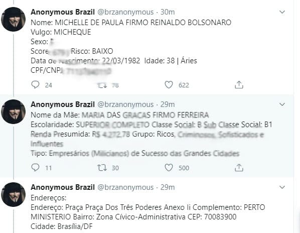 Entre os dados vazados estão CPF, números de cartões de crédito, endereços, telefones e e-mails que seriam da mulher de Jair Bolsonaro. Dados de Maria das Graças Ferreira, mãe de Michelle, também foram publicados na rede social.