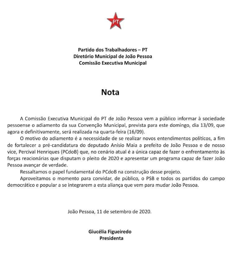 A convenção do PT de João Pessoa, que seria realizada neste domingo, 13, foi adiada para a quarta-feira, 16, último dia para a homologação das candidaturas às eleições 2020 como o ParlamentoPB havia antecipado na tarde de ontem. A comissão executiva municipal se reuniu ontem à noite e justificou que o adiamento é necessário para “realizar novos entendimentos políticos, a fim de fortalecer a pré-candidatura do deputado Anísio Maia a prefeito de João Pessoa e do vice, Percival Henriques (PCdoB)”.
