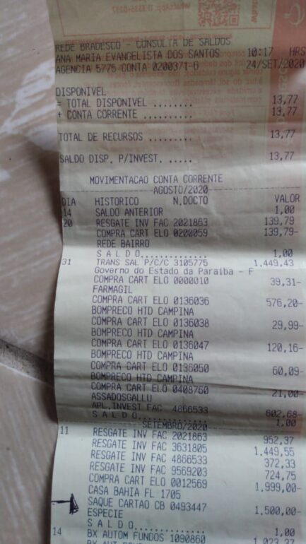 Ao retirar o extrato de sua conta, Ana se deparou com o inevitável: de posse do cartão e da senha, o indivíduo realizou compras e saques em lojas e agências de toda Campina Grande, onde, no total, embolsou R$ 9343 da vítima que por ser ex-portadora de câncer de mama e ter problemas cerebrais e pulmonares, guardava este dinheiro para a realização de exames e compra de medicamentos sem precisar se submeter ao sistema público de saúde.