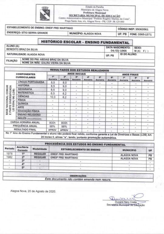 A coligação Juntos somos mais fortes do candidato Benedito Braz da Silva (Cidadania), que concorre ao cargo da prefeitura de Matinhas, no Agreste do estado, apresentou os documentos que comprovam que o candidato é alfabetizado.