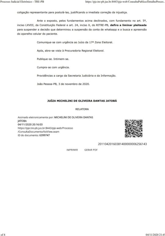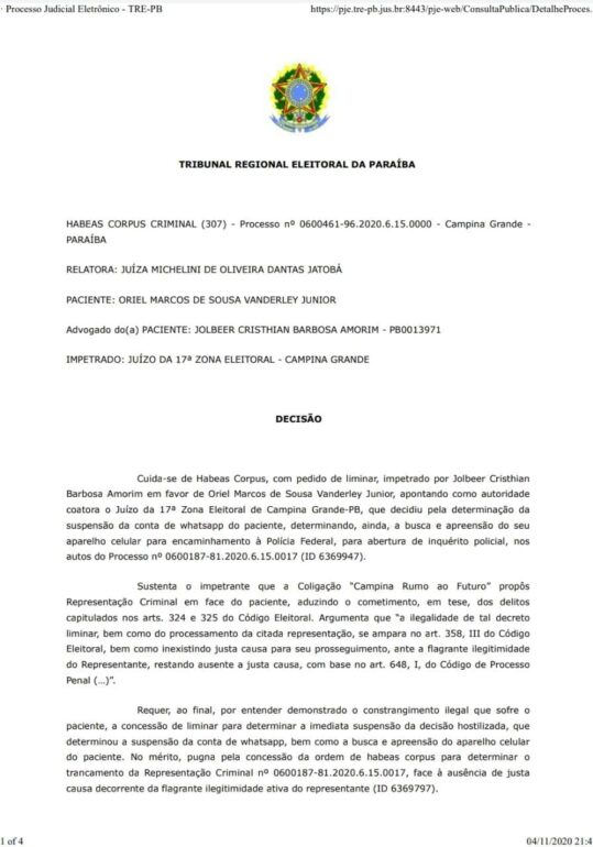 A juíza eleitoral Michelini de Oliveira Dantas Jatobá, do Tribunal Regional Eleitoral da Paraíba, suspendeu a decisão do juiz Bartolomeu Correia Lima Filho, da 17ª Zona de Campina Grande, que pedia a suspensão da conta de whatsapp e a busca e apreensão do aparelho celular de Oriel Marcos de Sousa Vanderley Junior. Bartolomeu é responsável, nas eleições deste ano em Campina Grande, pelas redes sociais e guia eleitoral de rádio e televisão.
