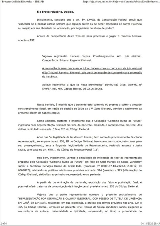 Na decisão, a juíza do TRE-PB cita o que considera “a ilegalidade de tal decreto liminar, bem como do processamento da citada representação, se ampara no art. 358, III do Código Eleitoral, bem como inexistindo justa causa para seu prosseguimento, ante a flagrante ilegitimidade do Representante, restando ausente a justa causa, com base no art. 648, I, do Código de Processo Penal (…)”.