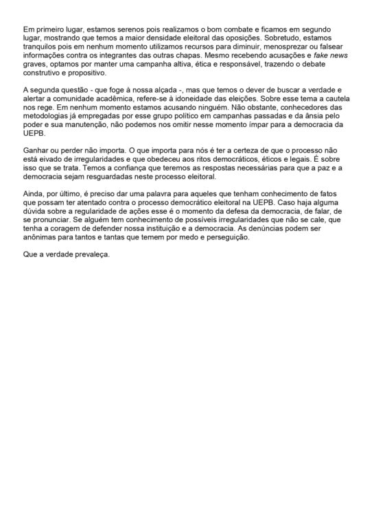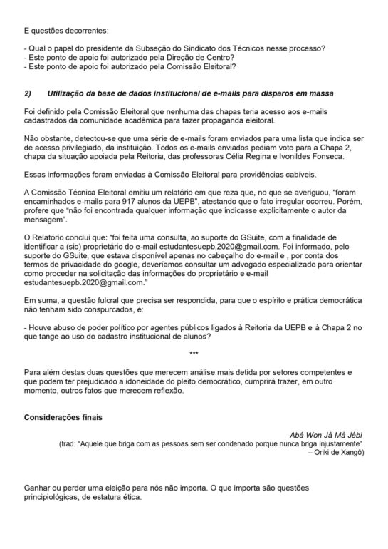 Segundo a defesa, “nestas últimas eleições recebemos inúmeros relatos, dos quais citaremos os dois que consideramos bem graves. São questões que, pela gravidade e pelo grau de confiabilidade dos indícios, foram enviadas para a análise e providências junto à Justiça”, apontando a presença de um ponto de apoio de votação no Campus de Guarabira e utilização da base de dados institucional de e-mails para disparos em massa como problemas na votação.
