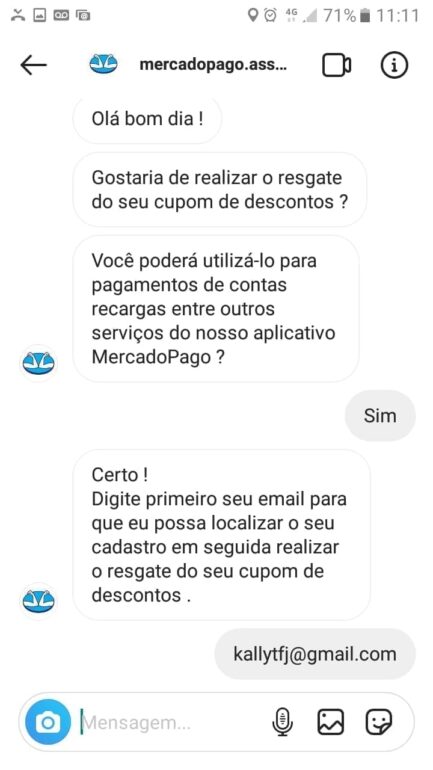 De acordo com Kaliaelson da Silva Calixto, após solicitar a compra das maquinetas no site oficial do Mercado Pago, ele recebeu uma mensagem, no Instagram, de um perfil supostamente ligado a empresa, informando sobre descontos de taxas. “Enviaram uma mensagem dizendo que, por adquirir as maquinetas, nós havíamos ganhado um bônus de R$ 100 de desconto nas taxas de juros das vendas”.