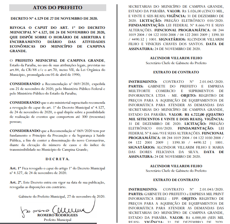 A realização de eventos com aglomerações, mesmo aqueles com até 300 pessoas, está proibida em Campina Grande por conta da pandemia. O decreto 4.529 revoga o artigo 1º do decreto 4.527 (de 24 de novembro deste ano) e foi publicado na edição de ontem do Semanário Oficial do Município. A determinação segue a recomendação conjunta expedida pelo Ministério Público Federal (MPF) e Ministério Público Estadual (MPE).