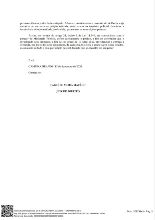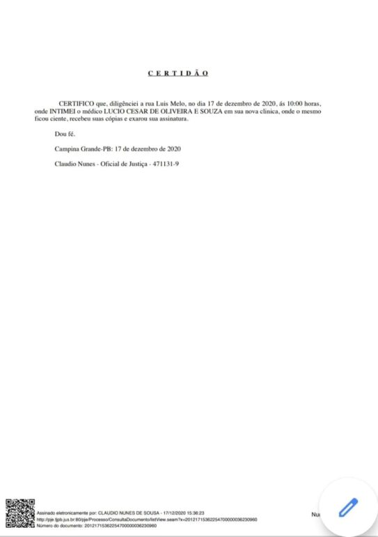 O Dr Lúcio César foi intimado pelo Juizado de Violência Doméstica e Familiar contra a Mulher de Campina Grande, pela ata da violência doméstica para entregar os pertences pessoais que tomou da ex-esposa, como roupas, joias e bicicleta.
