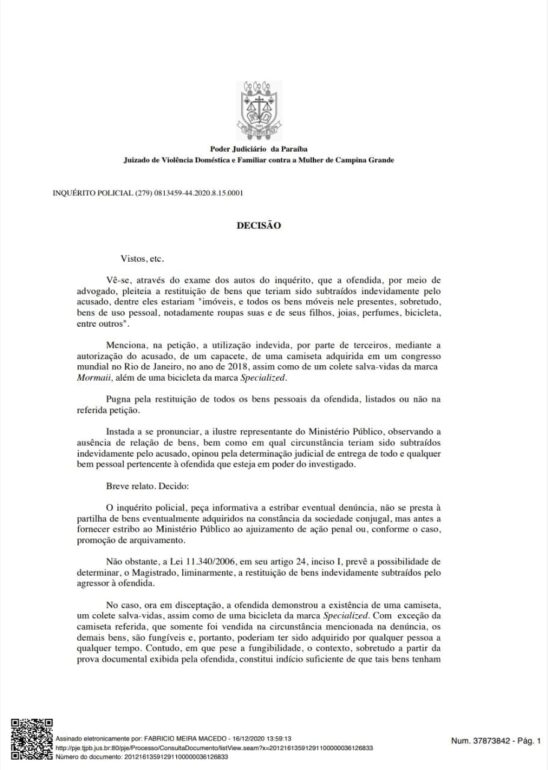 “Vê-se, através do exame dos autos do inquérito, que a ofendida, por meio de advogado, pleiteia a restituição de bens que teriam sido subtraídos indevidamente pelo acusado, dentre eles estariam “imóveis, e todos os bens móveis nele presentes, sobretudo, bens de uso pessoal, notadamente roupas suas e de seus filhos, joias, perfumes, bicicleta, entre outros”.” diz o documento.