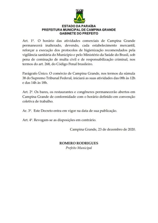 A Prefeitura de Campina Grande, através do decreto 4.539, assinado pelo prefeito Romero Rodrigues nesta terça-feira, 23, permite que bares e restaurantes abram as portas normalmente, desde que respeitem as medidas de prevenção e combate ao novo coronavírus, nesta quinta-feira (24), véspera de Natal, assim como no dia de Natal, na véspera de Ano Novo e no dia primeiro de janeiro de 2021. O decreto já vigora nesta quarta-feira (23), data de sua publicação.