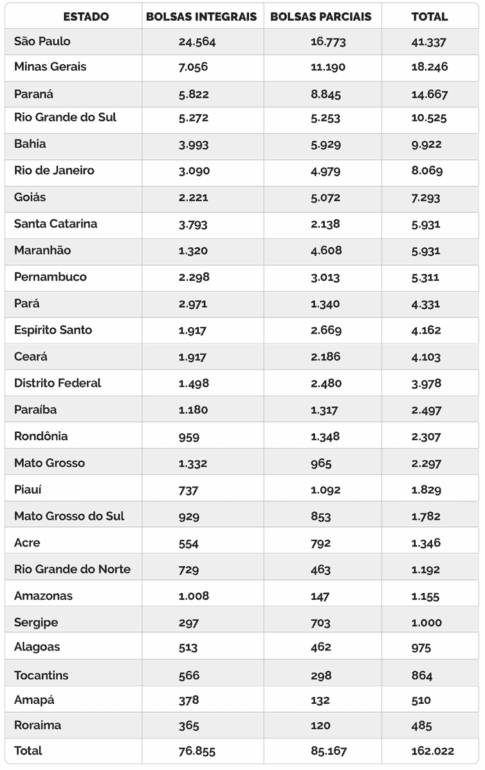 Nessa primeira seleção, o ProUni oferta 162.022 bolsas, sendo 76.855 integrais e 85.167 parciais, segundo o Ministério da Educação (MEC). Os estados com o maior número de bolsas ofertadas são São Paulo, Minas Gerais, Paraná e Rio Grande do Sul.