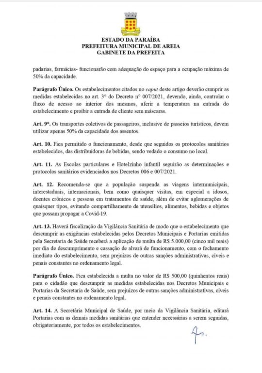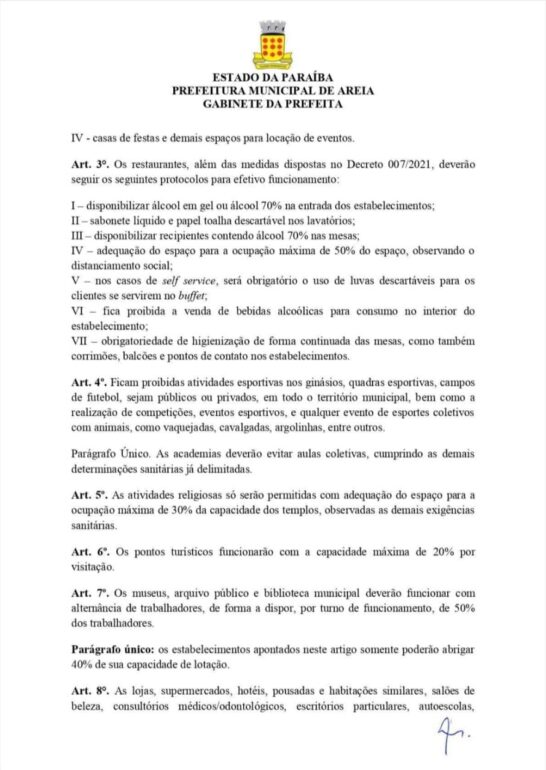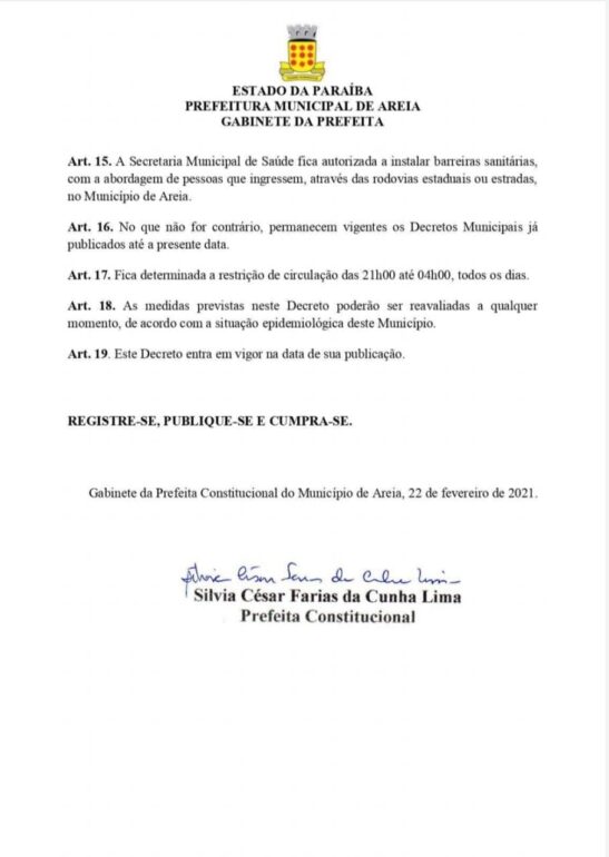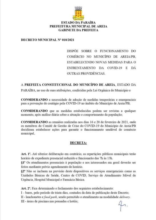A prefeita da cidade de Areia/PB, Silva Cesar (PSC), publicou nesta segunda-feira (22), um decreto com novas medidas no combate a Covid-19.