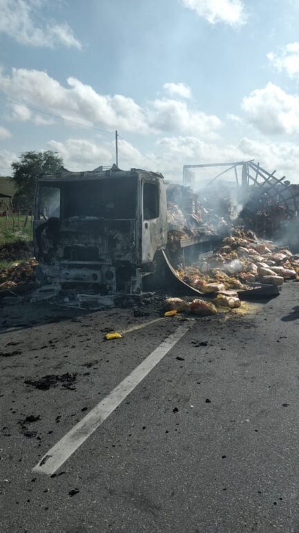 Uma carreta que transportava fubá, pegou fogo na manhã desta terça-feira (09), próximo ao acesso da cidade de Juarez Távora, no KM 112, da BR-230, no Agreste do estado.