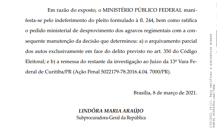 No parecer a subprocuradora-geral da República Lindôra Araújo defende que o Supremo deve manter a decisão de arquivar apenas a apuração relativa ao crime de falsidade ideológica eleitoral (art. 350 do Código Eleitoral) e remeter os autos para a Justiça Federal de Curitiba, para prosseguimento da investigação.