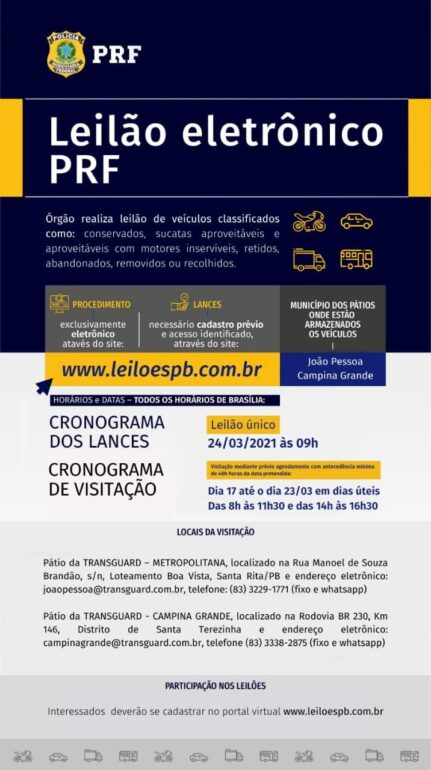 A Polícia Rodoviária Federal (PRF) realizará no dia 24 de março, quarta-feira, leilão de veículos que foram retidos em fiscalizações ou abandonados e removidos para os pátios conveniados. O leilão ocorrerá exclusivamente na modalidade eletrônica.
