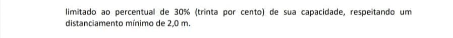 No documento, fica decretado que academias e igrejas poderão funcionar com horários e capacidade limitada, no caso das igrejas, o limite máximo dos locais é de 30%, respeitando um distanciamento mínimo de 2 metros.