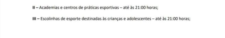 Em relação as academias, no novo documento estes estabelecimentos, só poderão funcionar até as 21 horas, respeitando todos os protocolos já afirmados ao longo da pandemia.