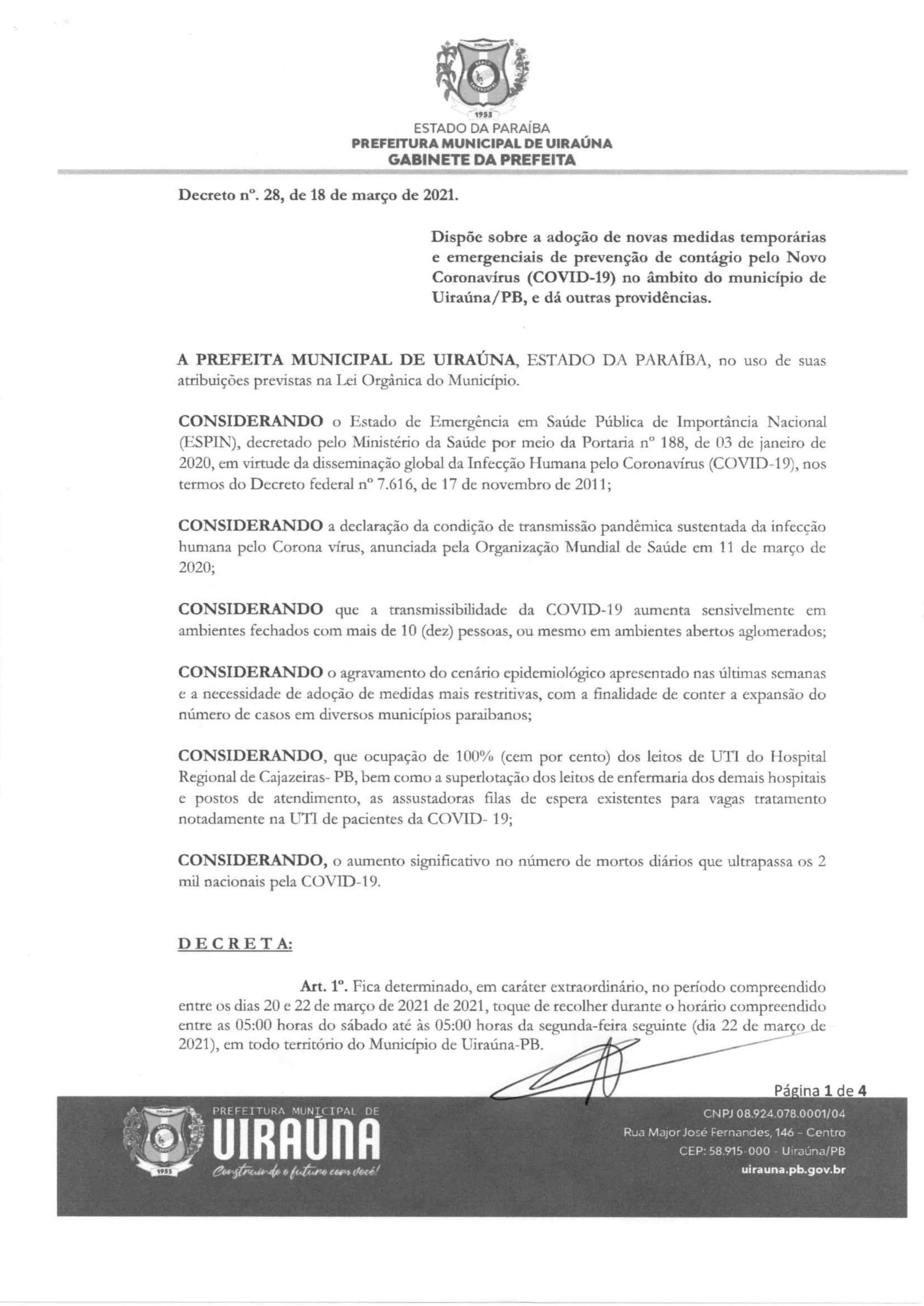 A Prefeitura de Uiraúna decretou um toque de recolher que vai durar todo este fim de semana. De acordo com o decreto, a população do município não deve sair de casa a partir das 5h deste sábado (20) até às 5h da segunda-feira (22). O objetivo é conter a disseminação da covid-19.
