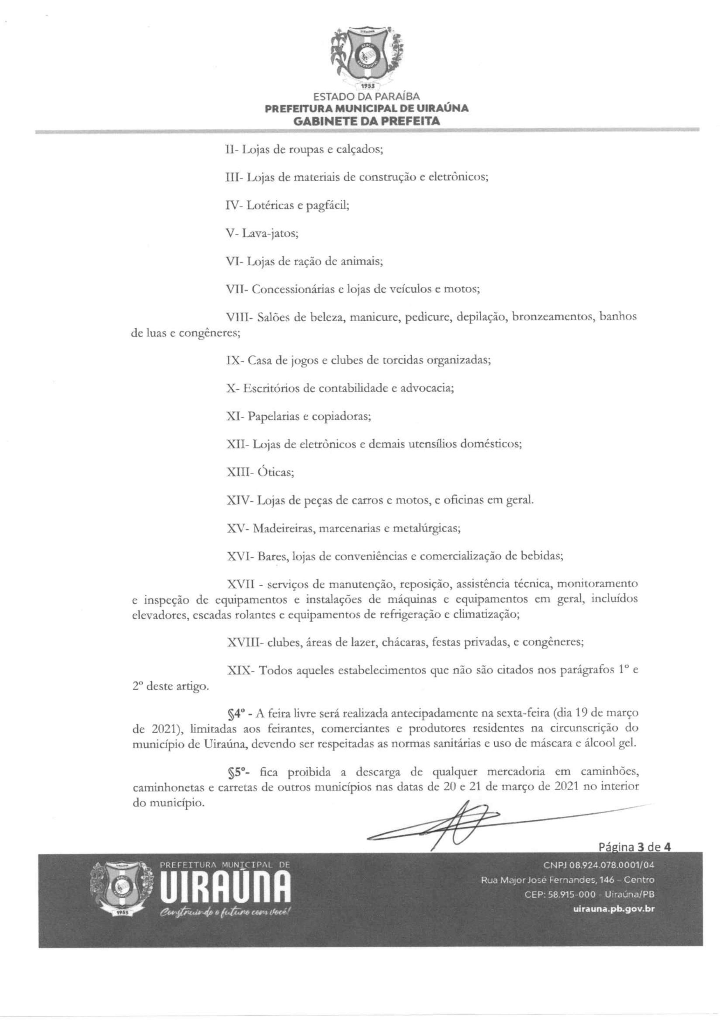 Podem funcionar realizando entrega em domicílio: restaurantes, padarias, lanchonetes, distribuidoras de água e gás, pizzarias e sorveterias e açaís. A feira livre será realizada antecipadamente nesta sexta-feira (19).
