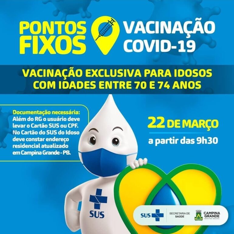 A Secretária de Saúde de Campina Grande, divulgou que a partir desta segunda-feira (22), irá expandir os pontos de vacinação, para atender o público de 70 a 74 anos.