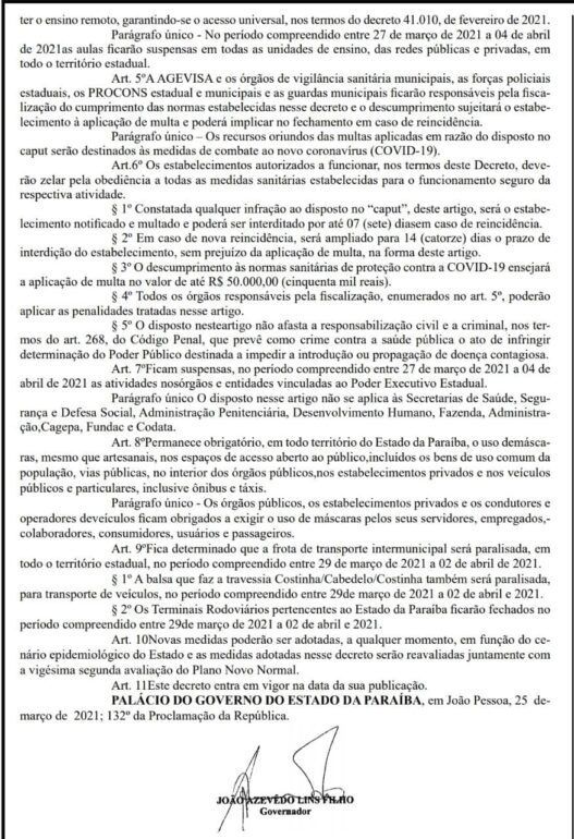 Já os estádios, ginásios, centros esportivos e os parques pertencentes ao estado ficarão fechados. As missas, cultos e cerimônias religiosas presenciais também seguirão suspensos no período, ficando asseguradas as atividades de preparação, gravação e transmissão das celebrações, bem como as ações de assistência social e espiritual, atendendo as recomendações sanitárias.