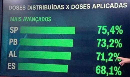 De acordo com os dados, o estado da Paraíba utilizou 73,2% das doses recebidas pelo Ministério da Saúde pelo Plano Nacional de Vacinação.