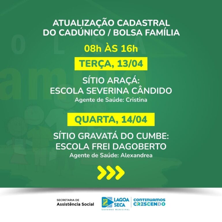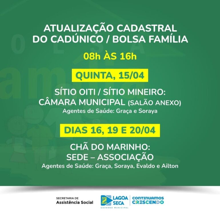 A partir dessa semana, a Secretaria de Assistência Social de Lagoa Seca – PB, inicia o processo de atualização cadastral dos usuários dos programas sociais oferecidos pelo poder público. Os trabalhos serão coordenados pelo Departamento de Cadastro Único e Programa Bolsa Família, que elaborou um calendário de atendimento para evitar transtornos durante todo o processo. Na primeira semana a atualização será realizada nas comunidades do Oiti, Araçá, Gravatá do Cumbe, Mineiro e Chã do Marinho.