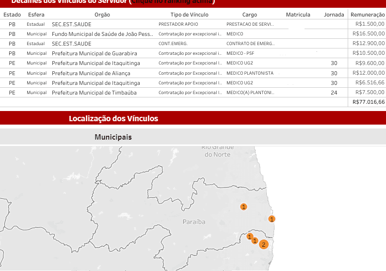 O profissional mantém contratos com a Secretaria de Saúde do Estado e com duas prefeituras paraibanas, além de vínculos com três outros municípios no Estado de Pernambuco.