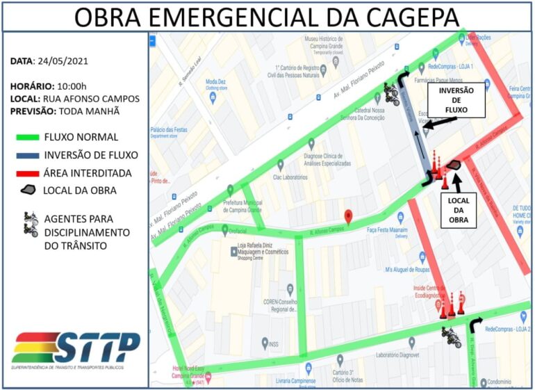 A Prefeitura de Campina Grande, por meio da STTP, informa sobre a realização, na manhã desta segunda-feira, 24, de serviços emergenciais da Cagepa, realizados próximo à rua Vila Nova da Rainha, no centro da cidade. Por conta dessa atividade foi necessária uma interferência no trânsito do local, onde está sendo realizado um contra fluxo na rua Bento Viana (lateral da Catedral), conforme mapa em anexo.