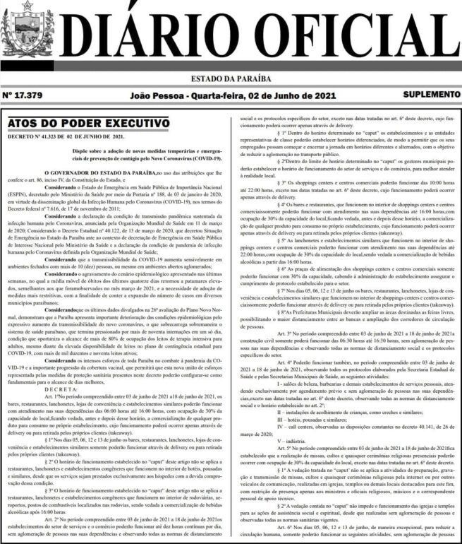 Diário Oficial do Estado (DOE) publica, em edição suplementar, nesta quarta-feira (2), o decreto que disciplina as atividades na Paraíba entre os dias 3 e 18 de junho. As novas diretrizes levam em consideração os dados da 26ª avaliação do Plano Novo Normal que classificou 95% dos municípios em bandeiras laranjas e 5% em bandeiras vermelhas, bem como apontou o aumento da transmissibilidade do novo coronavírus, o que tem provocado o aumento de internações diárias e a ocupação de mais de 80% dos leitos de Unidade de Terapia Intensiva (UTI), mesmo diante da ampliação do atendimento hospitalar em todas as regiões do estado.