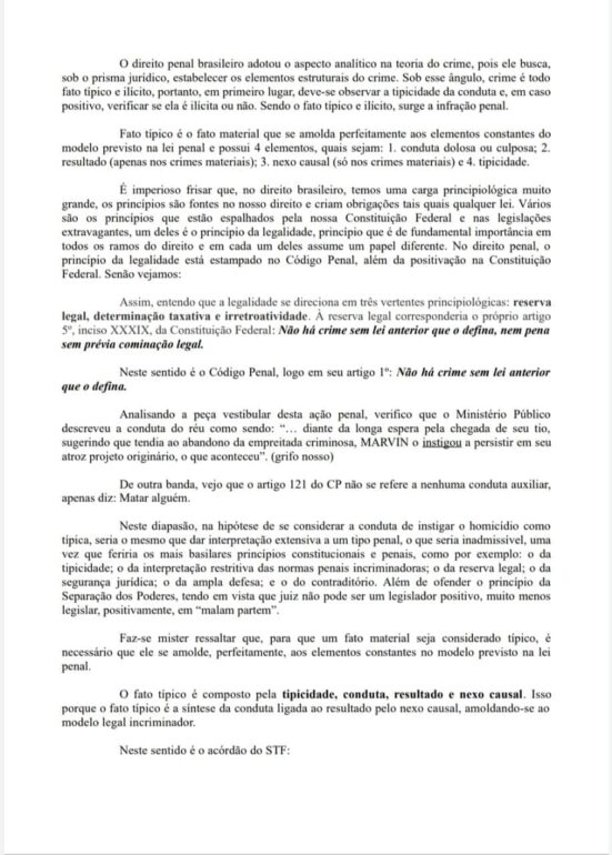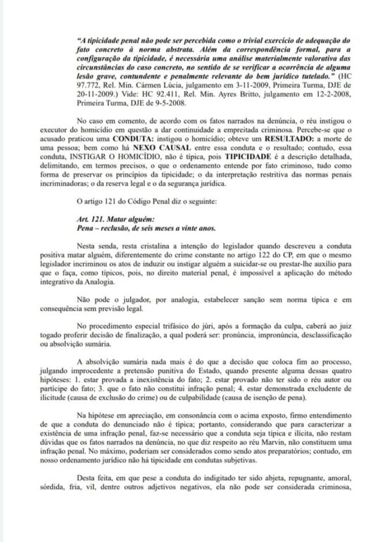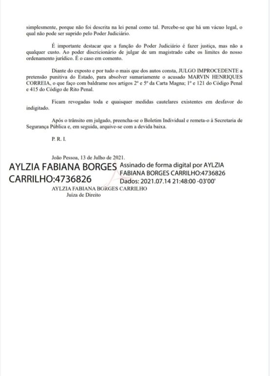 A Justiça, após análise da peça da defesa, entendeu não haver participação do acusado no homicídio e nem que o mesmo tenha praticado nenhum crime tipificado no Código Penal Brasileiro decidindo assim pela absolvição sumária do acusado. Ao ser ouvida, a advogada de defesa, Raylla Asfóra, comenta: